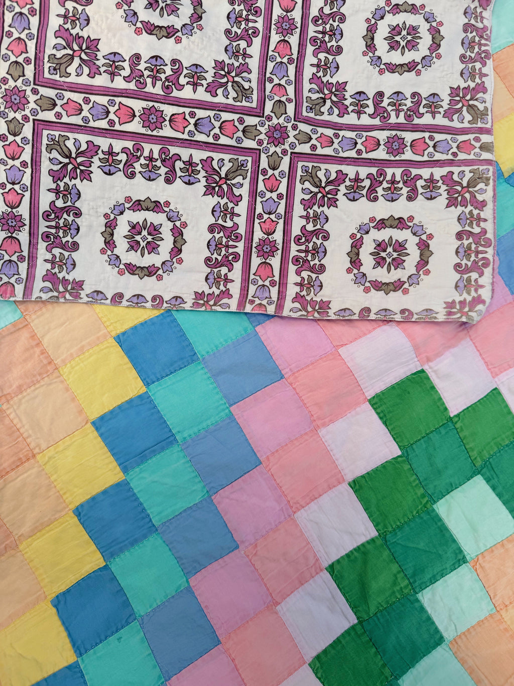 This is an American antique quilt made circa 1960, It is a beautiful Trip Around the World pattern,hand quilted and hand pieced with solid dyed pieces in pastel pinks, lavender, aquas, greens and yellows. This quilt is thin, lightweight, and has a little loft. The backing is a beautiful bold printed cotton. This quilt is well loved in places, but the colors are beautiful! If you have further questions, please direct message us and we are happy to send you a video.