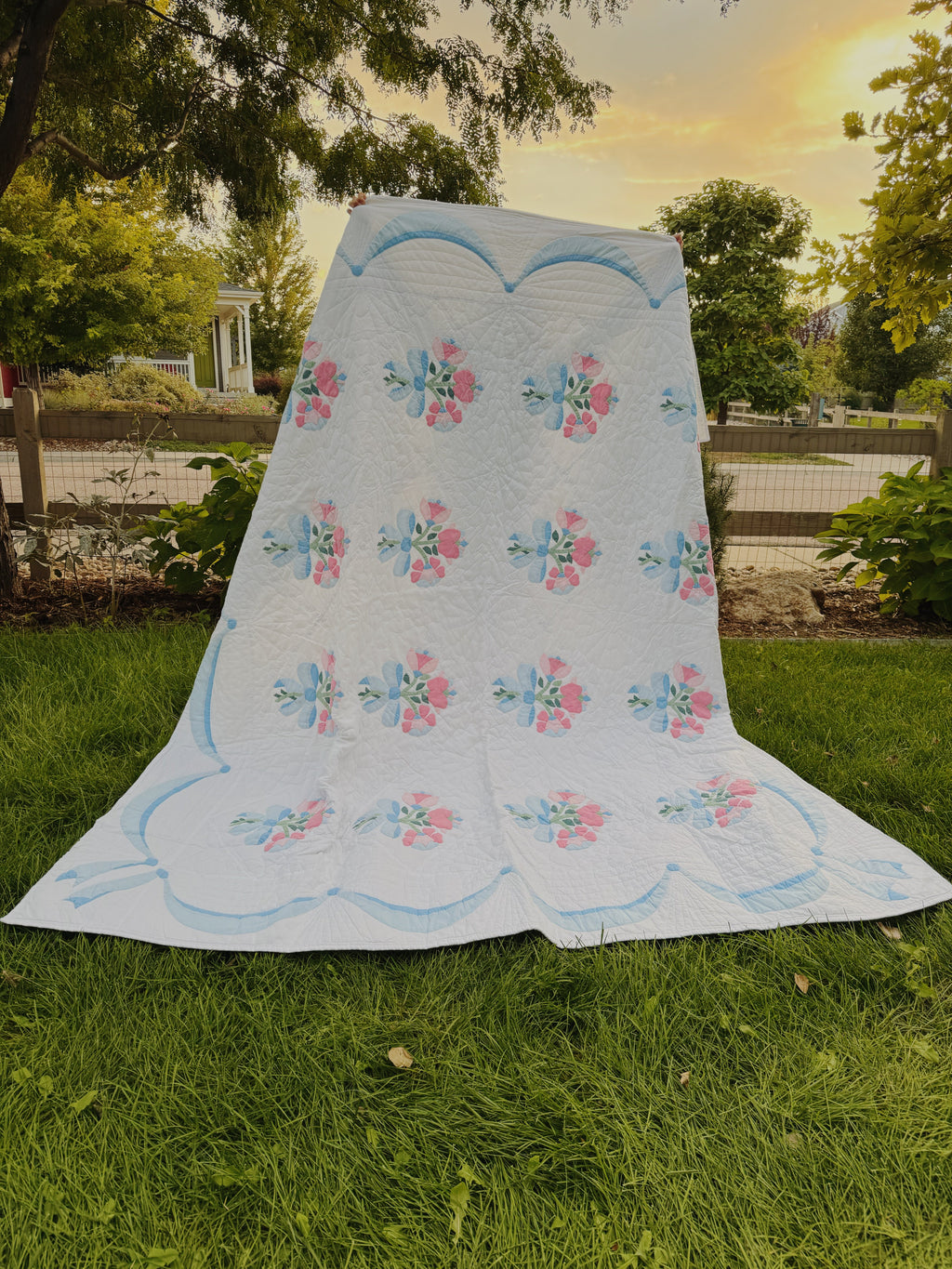 This is an American antique quilt made circa 1940s, It is a gorgeous Appliqué Floral Spray. This quilt is hand quilted and hand pieced with beautiful pastels and bright white cotton fabrics. This quilt is thin, lightweight, and has a little loft. The backing is a beautiful bright white. If you have further questions, please direct message us and we are happy to send you a video.
