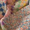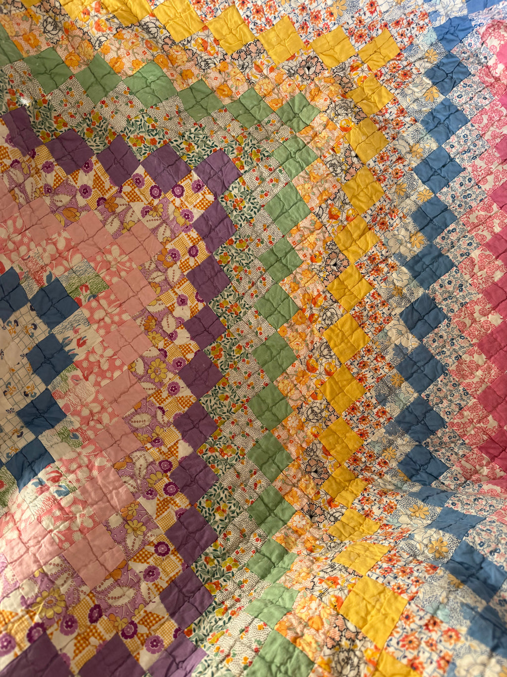 This is a classic Trip around the World pattern. This quilt is hand quilted and hand pieced with beautiful bold and pastel colors. This quilt is thin, lightweight, and has a little loft. The backing is a lovely blue floral (see photos). If you have further questions, please direct message us and we are happy to send you a video.