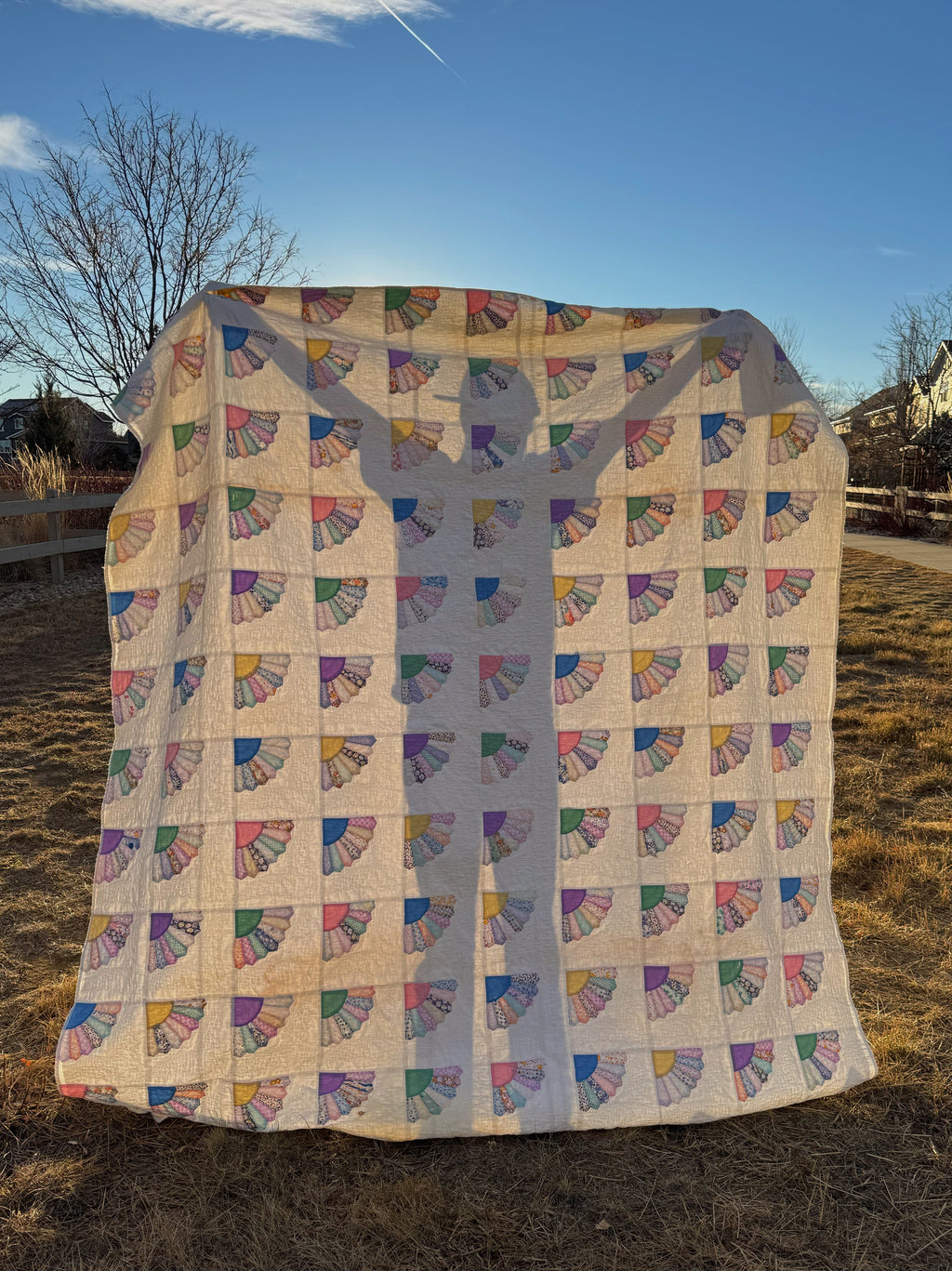 This quilt is made in a Fan, or Half Dresden Plate, pattern using small pieces of printed cotton fabric arranged in curved shapes. It was likely made between 1925 and 1940, a time when Dresden-style quilts were very popular in the United States. The soft pastel colors and delicate hand stitching reflect everyday fabrics and careful home craftsmanship of the era. Quilts like this were often created from fabric scraps and used both as warm bedcovers and as decorative expressions of creativity in the home.
