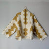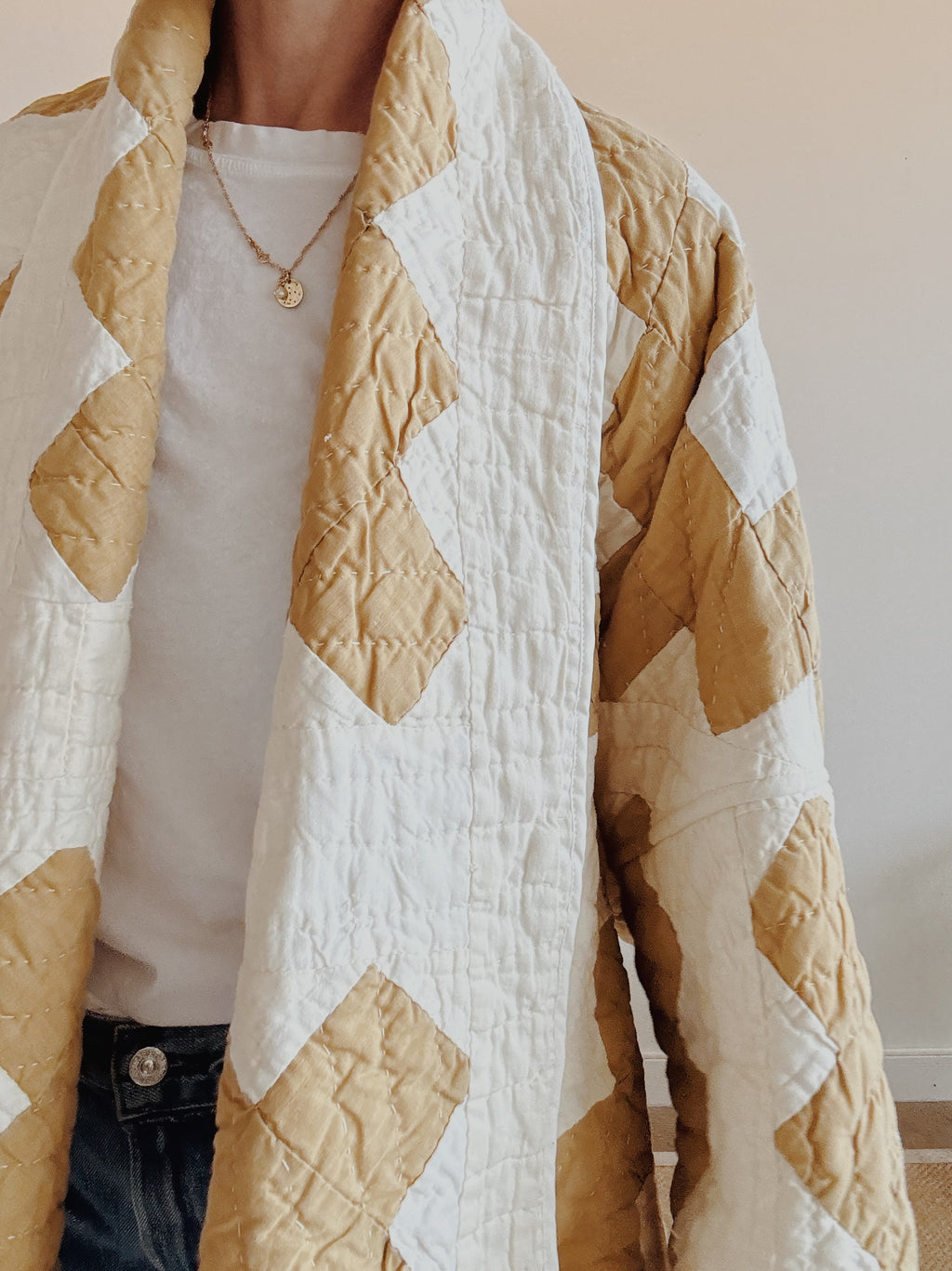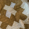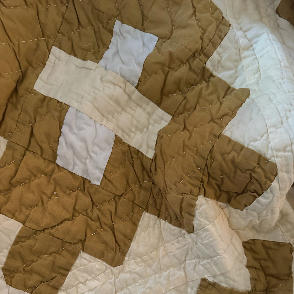 Hand quilted and hand pieced with a beautiful neutral palette. This quilt is a thick, and has quite a bit of loft. The backing is a beautiful creamy white . If you have further questions, please direct message us and we are happy to send you a video.